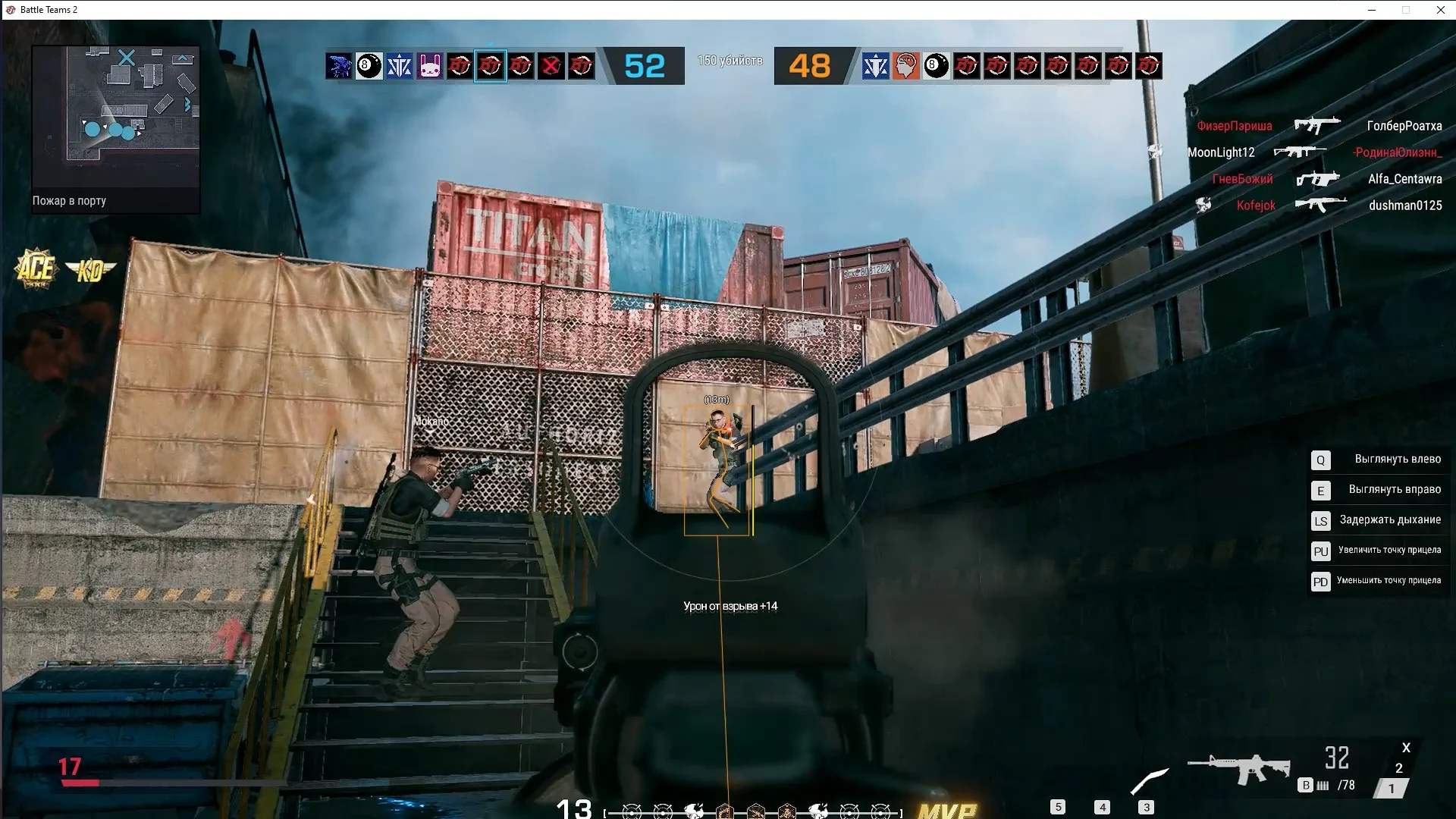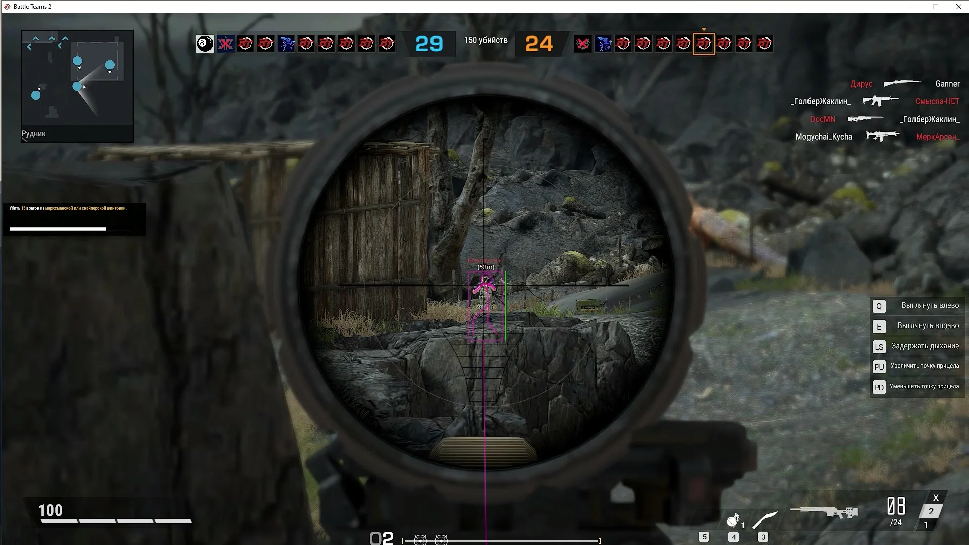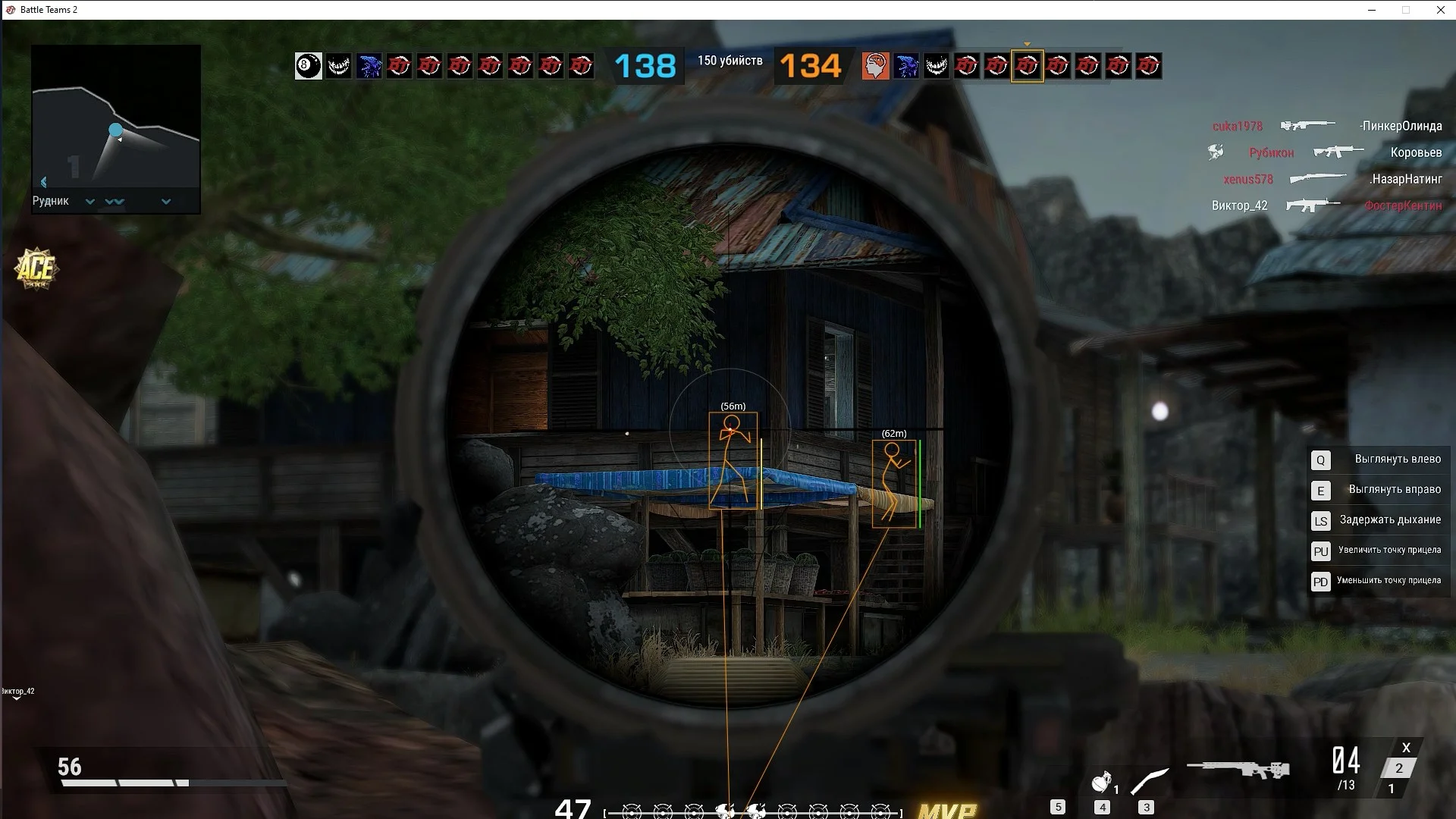 Наш новый приватный чит для Battle teams 2 оснащён множеством полезных функций. Так, например, ESP поможет не только видеть противников за препятствиями, но и поможет узнать сколько у противника брони/хп и расстояния до него. Визуал также можно настроить под себя, выбрав комфортные вам цвета и типы отрисовки (боксы/скелеты). Аимбот порадует вас гибкой настройкой с упором в безопасность использования и комфорт настройки. Команда wh-satano регулярно обновляет приватный чит для для Battle teams 2, поддерживает и улучает его работу, что только укрепит безопасность софта и поможет ему оставаться актуальным. Не проходите мимо нашего чита и будьте одним из первых, кто получит неповторимый опыт от Battle teams 2.Системные требования