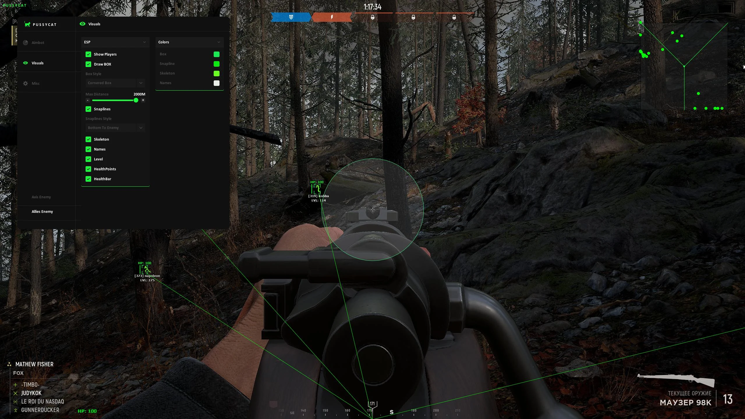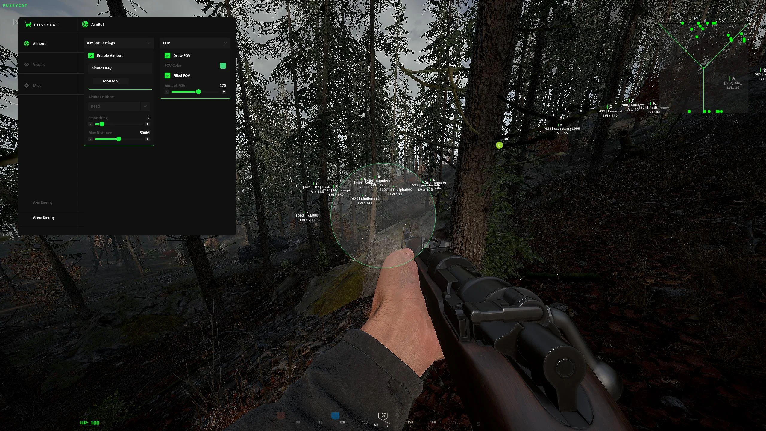 Pussycat — это доступное и функциональное решение для Hell Let Loose от разработчика Pussycat, ориентированное на удобство, стабильность и практичный набор возможностей. Софт отлично подойдёт игрокам, которые хотят повысить эффективность в боях без переплаты за избыточный функционал. В арсенале присутствует аимбот с удобной и понятной настройкой параметров, позволяющий адаптировать стрельбу под индивидуальный стиль игры. Он работает стабильно и помогает уверенно реализовывать перестрелки на средних и дальних дистанциях, что особенно важно в масштабных сражениях HLL. ESP / WallHack предоставляет приятное глазу и информативное отображение игроков с различными дополнительными настройками. Визуалы легко читаются и не перегружают экран, позволяя всегда быть в курсе расположения противников. Дополняет функционал радар, который помогает ориентироваться на карте и контролировать ситуацию на поле боя. Также в Pussycat предусмотрены полезные дополнительные опции: кастомный прицел, отображение собственного HP на HUD, спидхак для увеличения скорости передвижения и система конфигов для сохранения и быстрой загрузки настроек. Pussycat — это сбалансированное и выгодное решение для уверенной игры в Hell Let Loose.